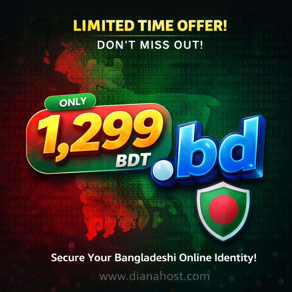DianaHost is currently offering a special limited-time price for.bd domain registration. This offer is designed for individuals and businesses who want to secure a strong Bangladeshi online identity at an affordable rate.